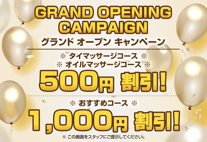 グランド オープン キャンペーン 大好き タイ古式マッサージ & スパ 下総中山店 | 下総中山 船橋本中山 タイ古式マッサージ